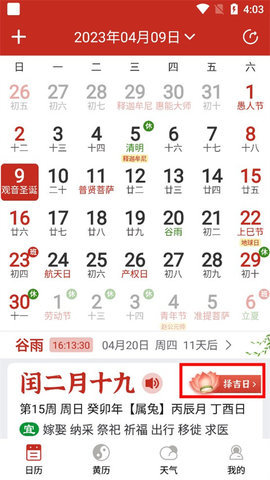 1、进入app后,可以看到当月的日历,点击下方的“吉日”;