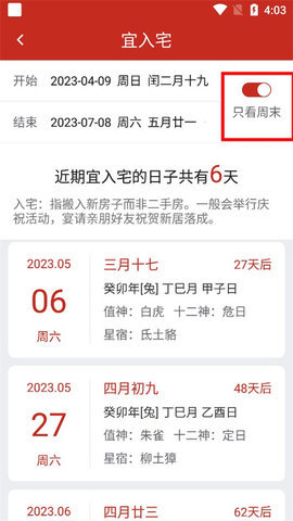 3、下面可以看到最近适合入户的日期,也可以打开只看周末,接下来的日子会出现适合入户的情况。