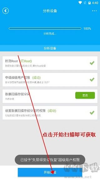 4、检测手机Root状态,软件将自动识别是否已Root。若显示未Root,请先使用Root工具进行授权操作,完成后点击“重新连接”。若不了解Root流程,可点击“点击下载”获取一键Root工具推荐使用:360一键Root、KingRoot、百度一键Root。