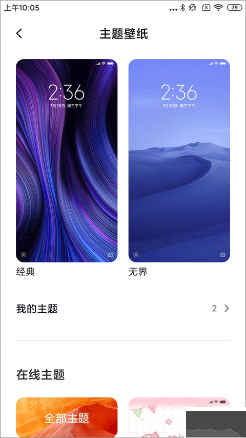 2、进入个性主题页面后,会看到经典主题、无界主题,还有在线主题资源。