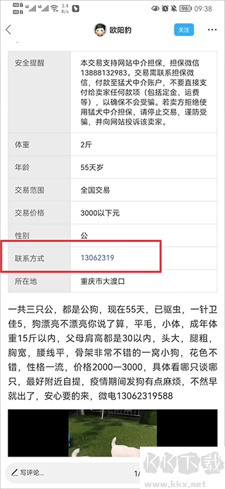 2、点击进入心仪狗狗的帖子后,会有卖家的联系方式,买家使用者能够通过电话联系卖家开展交易。