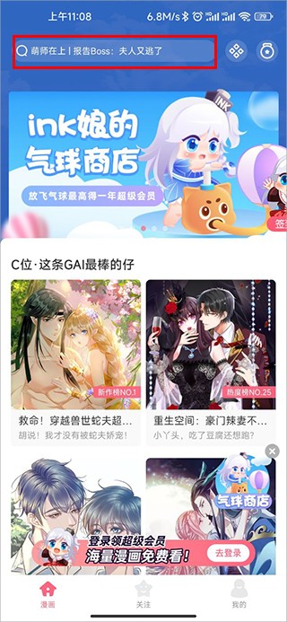 1、下载安装这款软件,完成后打开软件,在主页界面点击顶部的搜索框,搜索想看的漫画。