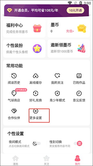 1、进入软件之后,在我的界面中点击底部的更多设置选项。
