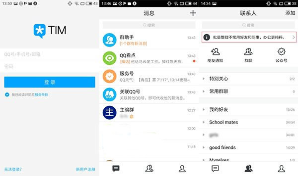 聊天功能小编就不再多说,实在不会自己找周围的老司机们带一下就全明白了。值得注意的是,在联系人界面(依旧是纯黑白,专治色狼……额,色盲)可以看到搜索栏下面多了一条“批量整理不常用好友和同事”的选项,点击上图红框进入后是这样滴: