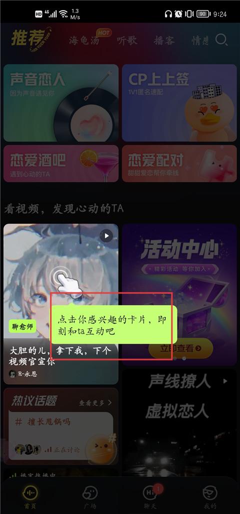 3、进入软件首页,为用户精选了很多优质视频,用户点击自己感兴趣的卡片就可以和他互动。