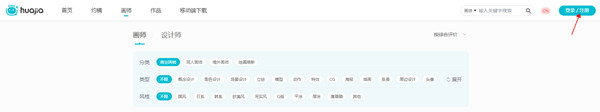 1、进入画加的官网,选择画师,点击右上角的注册进行注册。