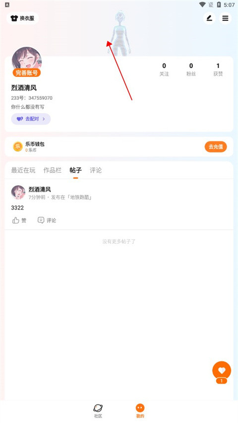1、进入233乐园,点击我的,点击右上方按钮所指地方。
