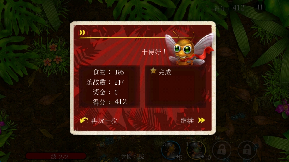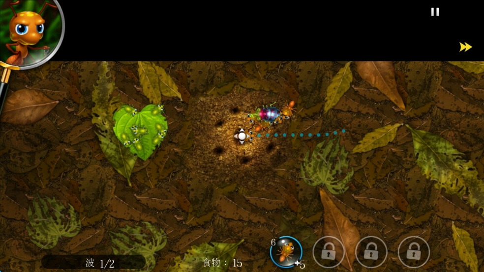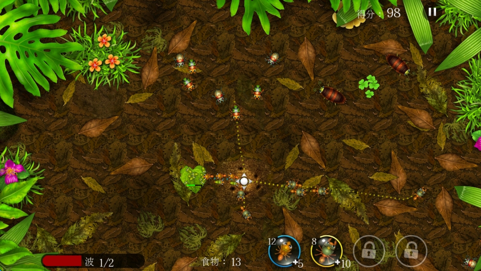 3、作为塔防,游戏采用了“波式”攻击,玩家可以在屏幕左下方看到当前的攻击次数和总的攻击次数。收集了多少食物决定了玩家可以派遣多少个蚂蚁,每个蚂蚁消耗的食物数量也不相同,这和其他塔防游戏的设定基本一致。需要注意的是,如何平衡攻击和收集的比例是一个关键。狂出士兵不出工蚁不行,只出工蚁更不可取,所以玩家要做到一个平衡。