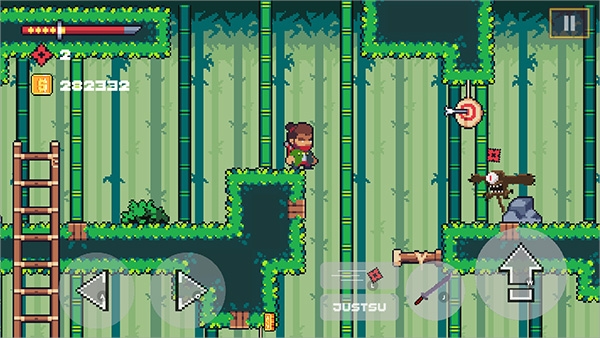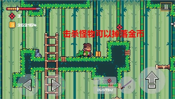 1、操控忍者左右移动、跳跃,可以点击攻击键使用武士刀攻击。