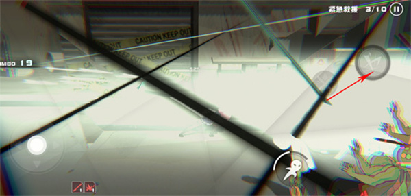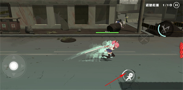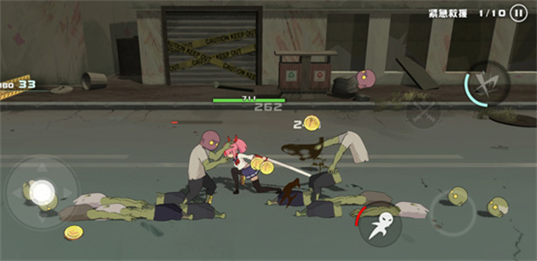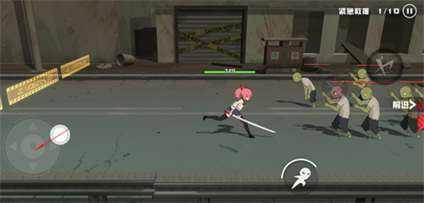 1、玩家能够靠着左下角的虚拟按键控制角色移动,前方会出现很多的僵尸,需要小心。