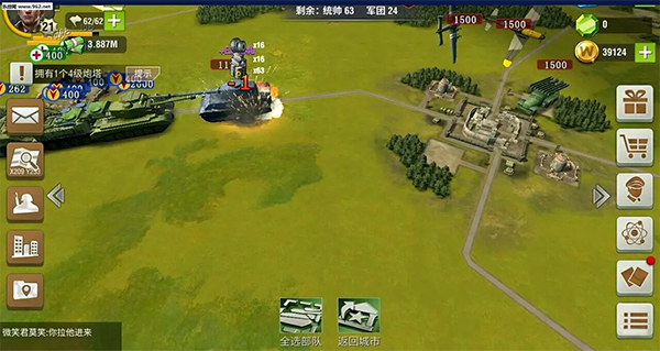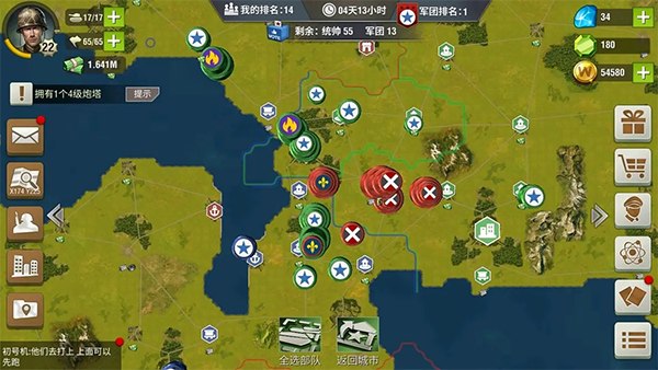 3、需要注意是要懂兵种克制,要知道四级塔的射程要会引反叛军的重型坦克引到四级炮塔的射程之外,然后用大部队狂削1500的坦克,把坦克打掉之后就是引飞机了这就需要战斗机了,要注意的是一定要会引而不是单纯的无脑操作,把全部部队都压上你会死的光光的。需要注意的是,你要打鹰城要在鹰城附近占领一个城而且这个城要是15级,否则你打不下来鹰城的核心的。而且还会损失惨重。
