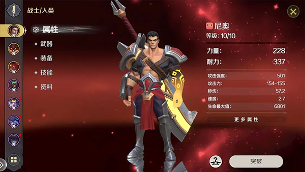 英雄部分主要分为:属性、武器、装备、技能和资料五个部分。