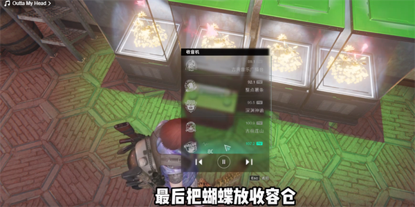 3、在它上面装上绿色的筒灯,然后连接电线,调到名为80摄氏度的音乐,最后把蝴蝶放收容仓。