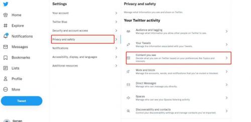 3.在【设置Settings】 中找到 【隐私和安全 Privacy and safety】右侧 【你看到的内容 Content you see】。